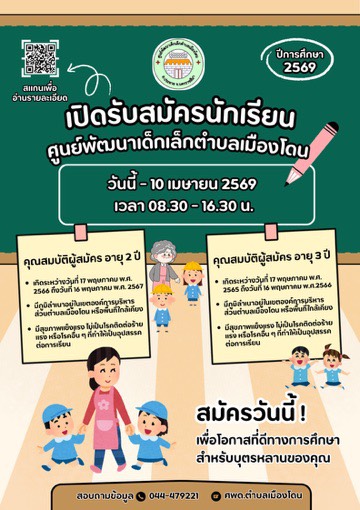 ศูนย์พัฒนาเด็กเล็กตำบลเมืองโดน เปิดรับสมัครนักเรียน ประจำปีการศึกษา 2569 ต้ังแต่วันนี้ - 10 เมษายน 2569 เวลา 08.30 - 16.30 น.